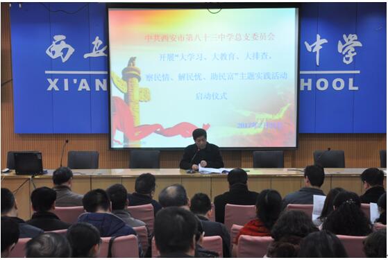 按照市委组织部和市教育局党委安排部署,我校党总支于2017年2月22日下午召开了全体党员大会,进行“大学习、大教育、大排查,察民情、解民忧、助民富”主题实践活动启动仪式。本次主题实践活动要求所有党支部结合“两学一做”学习教育,对标市委关于打造西安铁军,当好为民服务“五星级服务员”,切实加强党员干部群众观点、群众立场教育,切实以改进作风、为民服务的实际成效凝聚党心民心、汇集发展力量,推进学校教育教学工作稳步提升。