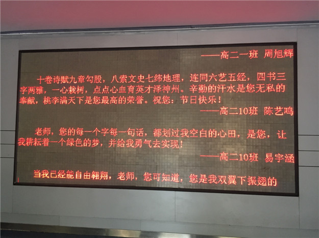 一进教学楼,就能看到缀有班级和姓名的温馨祝福语在电子屏滚动播放。这些祝福语一共有100余条,是从全校学生中征集而来,承载着学生对于老师的感谢与热爱。