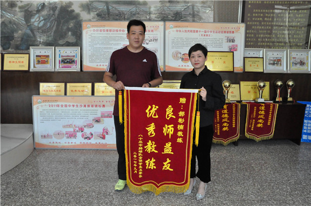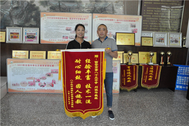 平时的训练和比赛情况,刘老师都通过家长微信群实时发给家长。家长们见证着孩子的成长与变化,家长们被学校的无私关怀、老师的精心指导、孩子们的顽强精神所感动,满怀感激之心将绣有“德才兼顾、爱生如子”、“泽流及远千里思源、春雨润物明德育才”等字样的锦旗送到了学校,以此感谢学校、老师对孩子的指导与关怀。