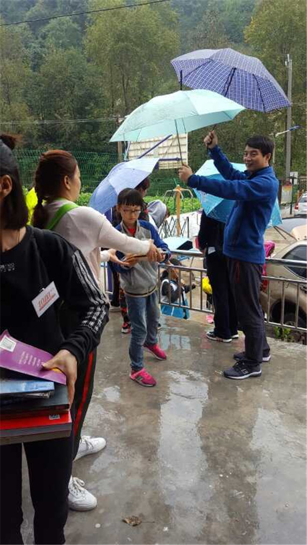 We set off for Yayu Village at the agreed time regardless of the bad weather. During the ride, some volunteers sang songs and played games in the front of the bus for the volunteers in order to have fun. My daughter sang an English song and told two jokes in front of the strange volunteers, which really surprised me and my wife, for we had never expected she dared to show in the presence of3 strangers. After a two-hour bus ride, we got to a narrow cement road leading up the mountain village, which was our destination. Because the cement4 road was too narrow for the bus to pass through, we had to walk about five kilometers up the winding5 and precipitous6 mountain road. We were walking up the mountain road when we found a volunteer’s car loaded with books trapped in the mud. We pushed together to make the car out of the mud, leaving our shoes covered in mud. It took us around an hour to get to Yaya Village, where the headmaster and some pupils were waiting for us in the driving7 rain.