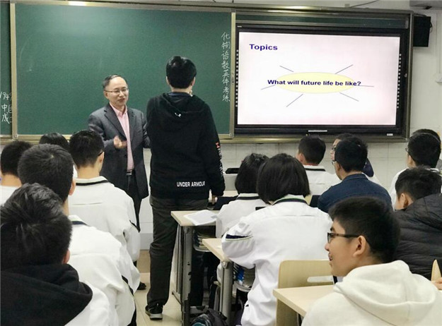 课堂主题为“Life in the Future”,刘老师让学生选择一个方面,谈谈五十年后的生活。上课热身环节,刘老师用一个关于“未来科技带给人类生活变化”的小视频,让学生观看并提出自己的想法,并根据本单元的阅读文章总结出未来社会的种种巨变。接着,话题细化到我们生活的方方面面,例如未来的交通、医疗、工作、教育等,通过小组讨论与汇报的形式,让学生畅所欲言,展示自己想象中未来社会的景象。