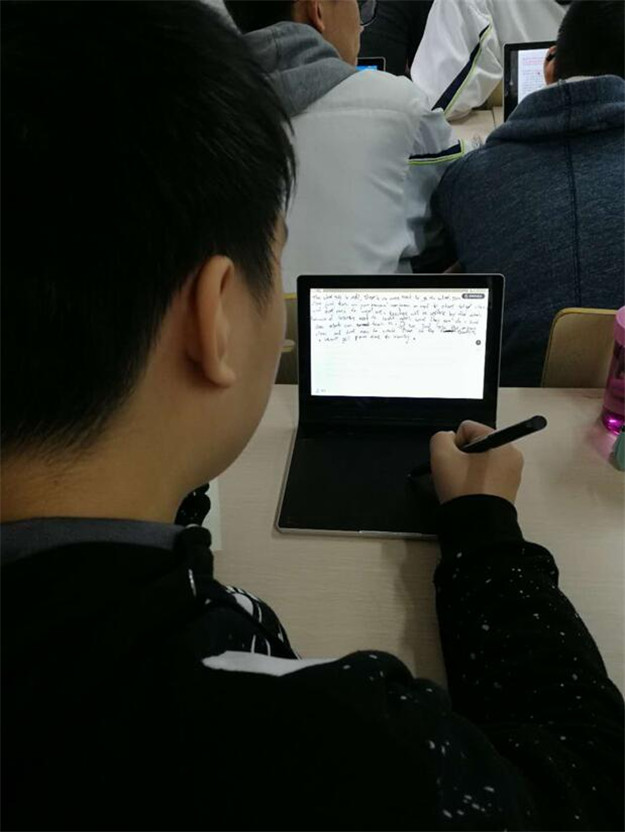 整个课堂的输入框架清晰,形式多样,内容合理充实。在输出环节,刘老师给了学生十分钟时间,先阅读一篇描述未来的短文,然后运用智慧课堂辅助工具,直接在电子设备上写出自己的文章,以便可以实时传输到网络教学系统中在课堂上展示。最后刘老师将同学们写的作文,在课堂上进行了分享与展示。