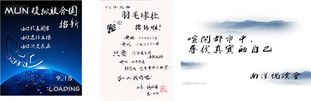 校团委下设学生会组织与22个社团,丰富学生课余活动。“南洋悦读社”实现了每月一次论坛的读书活动,通过读书分享、读书课程,提高学生阅读兴趣,同时也让阅读成为一种习惯;模拟联合国出战陕西省模拟联合国大会;辩论队在陕西省第二届中文辩论队中荣获了季军的好成绩;英语社联合CCTV进行了,希望之星英语比赛的海选活动;电影社进行微电影的拍摄,摄影社、篮球社、电影社、校园广播电视台等社团也深受同学们的喜爱。