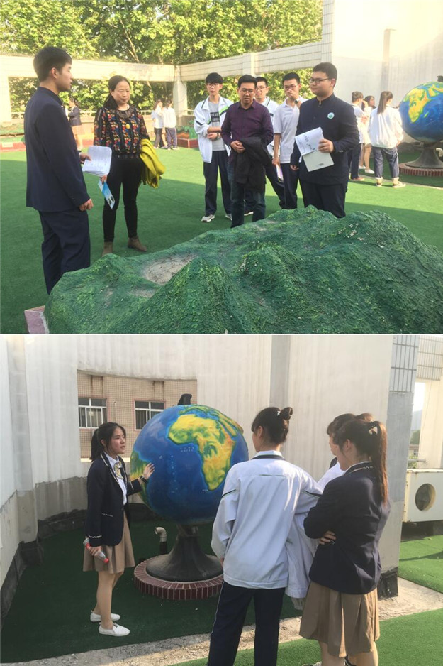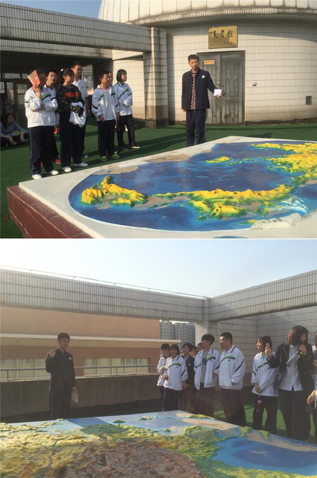 地理园的参观从中国立体地形模型开始,“小讲解员”们从我国地形三大阶梯开始,带领师生们一起感受我国高原山川的磅礴气势,领略平原丘陵的广阔富饶,培养同学们的爱国主义情怀,发扬爱国主义精神;接下来是世界立体地形模型,几位讲解同学描述了世界各大洲总体地形地势之后,分别有重点的讲解了大洋洲和非洲的地理知识,从地理位置、地形地貌、气候条件、风土人情、人种宗教等多方面为师生们呈现出了一个生动具体、别具风情的海外大洲,拓宽学生视野,培养全球化思维;紧接着,同学们对内外力作用形成的各种地貌类型进行参观。第一个模型为冰川地貌,讲解同学用我们熟悉的图片、电影,拉近了师生与遥远的冰川地貌的距离,把饮料“冰峰”与讲解内容结合起来,寓教于乐,大大激发了同学们地理学习的热情;黄土地貌的小讲解员来自陕北黄土高原,用一系列自己的亲身经历和切身感受为黄土地貌“正名”,引发同学们的阵阵笑声;讲解地下水地貌的两位同学采用你问我答、互相配合的全新形式,对重要概念进行强调,并自己绘制了一整套地下水循环示意图,帮助同学们了解模型。讲解员们解说生动有趣,同学们听得认真投入。最后,教务处主任王岚老师与苏元平老师亲临现场,认真倾听同学们的讲解,并被同学们主动学习地理知识的热情所打动,活动在苏丕礁老师的总结中画上了一个圆满的句号。