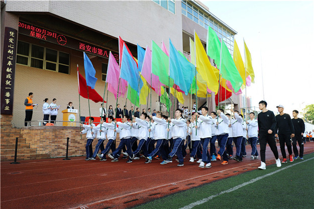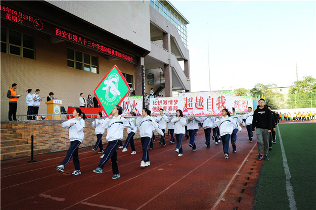 彩旗队员的目光深情而又自信,步伐矫健而又整齐,象征着我校体育工作的勃勃生机。