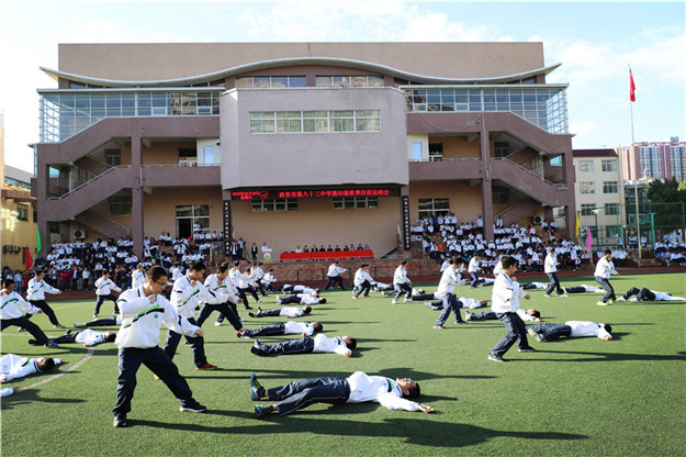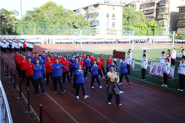 高一年级男生进行了擒敌拳的表演。他们身形矫健、拳脚敏捷、动作整齐、沉着有力,时而如松峙山岳,时而如白鹤亮翅,展现了阳刚之气。