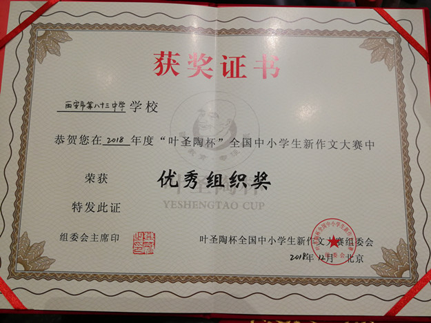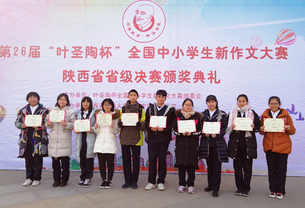 灵魂如有香气,文章自然飘逸 ——祝贺我校学子在第26届“叶圣陶杯”全国中小学生新作文大赛陕西省省级决赛中载誉而归 2018年12月30日,第26届“叶圣陶杯”全国中小学生新作文大赛陕西省省级决赛颁奖典礼在西安交通大学航天学校成功举办。我校参赛选手张震、马愉凯、赵昕颖、张若彤、王满鑫、石凌依、吴悦欣、高佳、刘宇萌、张艺腾由刘丽萍老师带队参加了此次活动。在此次活动中,经过初赛复赛两轮激烈的角逐,我校共有90位同学获奖,其中一等奖8人,二等奖17人,三等奖65人。我校也荣获“优秀组织奖”荣誉。王建霞、丁宏伟、高玲、郑晓娟、王晶、王娟、储敏、刘丽萍等老师荣获“优秀指导教师”称号。