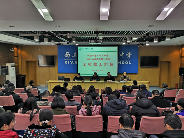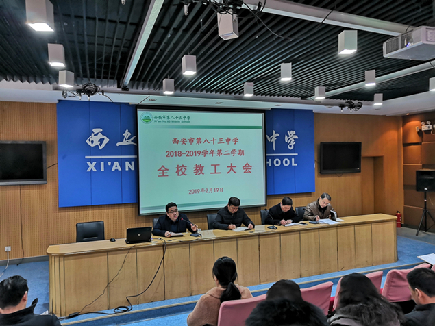2019年2月19日上午,西安市第八十三中学在学校多功能厅召开全体教职工大会和扫黑除恶专项工作推进会,会议由西安市第八十三中学校党总支书记李瑞民主持,学校校级领导和全体教职员工参会。