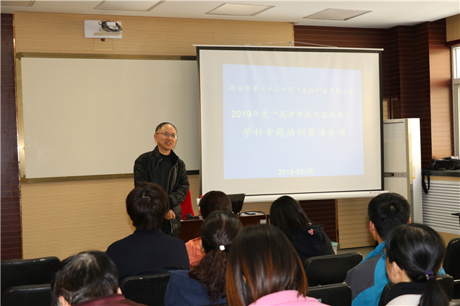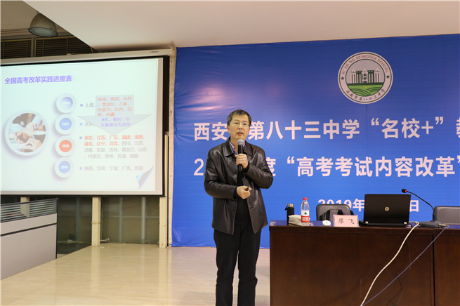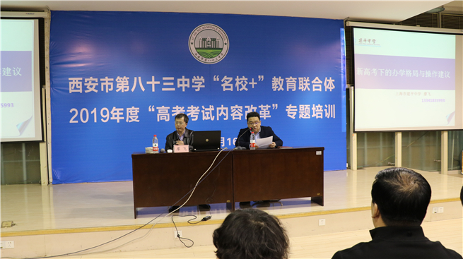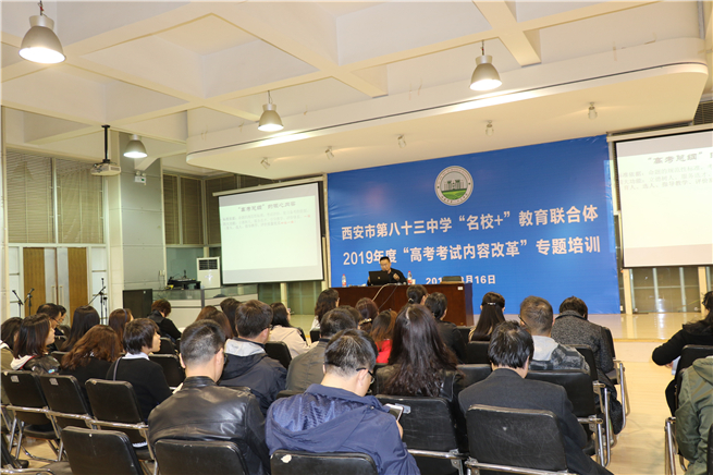 3月16日下午,西安市第八十三中学“名校+”教育联合体在市八十三中举行了主题为“高中学科教学如何有效应对高考考试内容的改革”的专题培训。来自西安市第八十三中“名校+”教育联合体成员校的市第八十三中学、市黄河中学、市第三十中学、市东方中学、西安行知中学的300多位教师及市第八十五中学、铜川市宜君中学、安康市汉阴中学等30多位教师也应邀参加了此次活动。