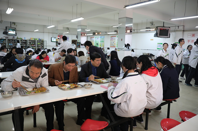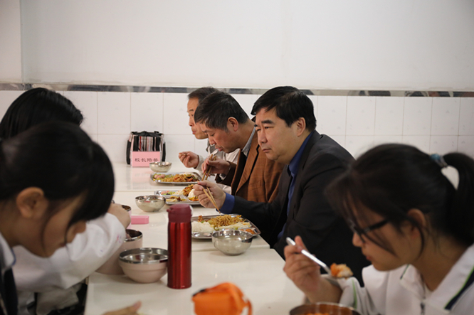 我校校领导刘忠建校长、李瑞民书记、李勇副校长与学生们共同进餐,询问学生的口味、饮食习惯等,倡导学生健康饮食。