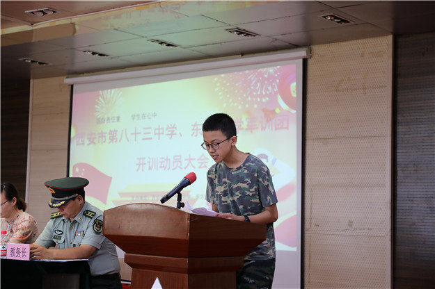 学生代表高一十班李亦泓同学说到,高一军训是高中生活的第一步,让我们互相鼓励,互相监督,走好这最具青春魅力的一步。在这次军训中,我们将一切行动听指挥,发扬不怕苦、不怕累的精神,争做优秀的八三学子,争当军训积极分子,争创军训先进连队。在教官的指导下,不怕流汗,不怕吃苦,严格训练,争取得到最有效的锻炼,为自己的人生档案留下最鲜亮的一笔!