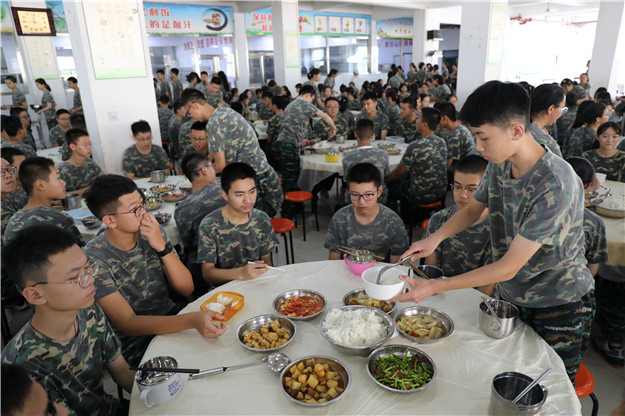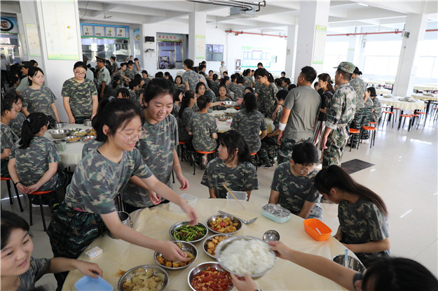 中午时分,全体学生首先学习“军队用餐仪式”,如何坐下,如何调整坐姿,如何轮流打饭……用餐仪式学习完毕,餐桌小队长给大家分餐。