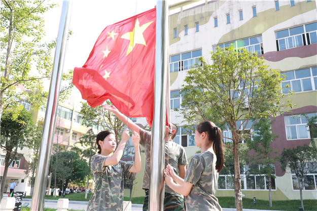 在雄壮的国歌声中,全体人员肃立,高唱国歌,心向祖国,重担肩挑!