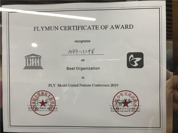 10月18至20日,我校十名同学参加了陕西省联合国教科文组织协会举办的2019年度中学生FLYMUN模拟联合国会议。在同学们的不懈努力下,我?;竦昧?/span>“最佳代表团”的奖项。