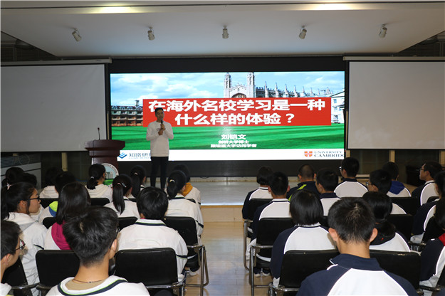 2019年10月23日下午,知路研修联合创始人、高级学术导师、剑桥大学工程博士、斯坦福大学访问研究员、剑桥大学与约翰霍普金斯大学双硕士刘铠文一行来到我校,为高一年级部分学生作了一场题为—“在海外名校学习是一种什么样的体验?”的报告,为大家带来了一场通往世界名校的分享盛宴。