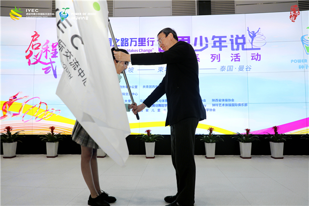 共青团西安市委徐辉副书记、陕西广播电视台胡劲涛台长也致辞祝福活动圆满成功。本次“世界少年说”的小使者原睿遥同学作为代表,表达了不负“使命”的少年激情。随后胡劲涛台长把“世界少年说”的队旗交到原睿遥手上时,完成了交旗帜仪式。