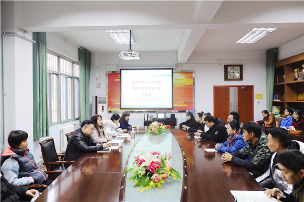 2019年11月29日,2019年陕西师范大学实习生实习工作总结会在图书科技楼二楼会议室成功召开。参加会议的有西安市第八十三中学沙涛副校长、教科研主任唐颖鸿老师、陕西师范大学实习带队的黄梅老师、十七位实习同学和部分指导教师。