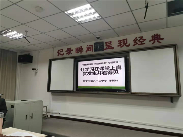 活动的第三板块是由名师工作室主持人于辉林老师做微报告——《让学习在课堂上真实发生并看得见》。于辉林老师是正高级教师、西安市学科带头人、西安市首批“名师+”研修共同体主持人、西安市第八十三中学“名校+”于辉林语文名师工作室主持人。