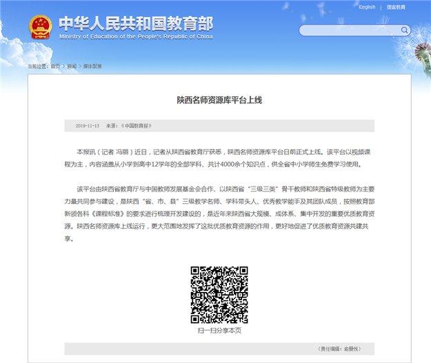 该平台由陕西省教育厅与中国教师发展基金会合作、以陕西省“三级三类”骨干教师和陕西省特级教师为主要力量共同参与建设,是陕西“省、市、县”三级教学名师、学科带头人、优秀教学能手及其团队成员,按照教育部新颁各科《课程标准》的要求进行梳理开发建设的,是近年来陕西省大规模、成体系、集中开发的重要优质教育资源。陕西名师资源库上线运行,更大范围地发挥了这批优质教育资源的作用,更好地促进了优质教育资源共建共享。