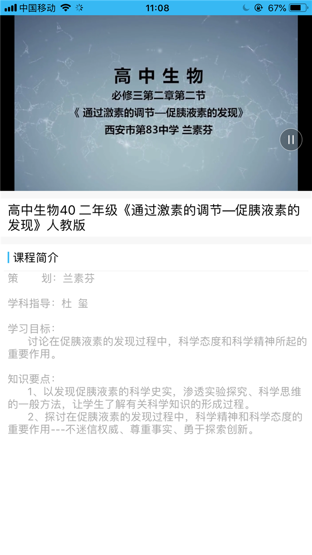 近日,从陕西省教育厅获悉,陕西名师资源库平台于2019年11月正式上线。我校生物学科兰素芬老师的视频课程《促胰液素的发现史》被陕西名师资源库平台作为该知识点的示范课例收录。