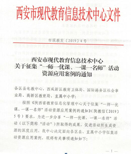 2019年1月18号,西安市现代教育信息技术中心发布关于征集“一师一优课,一课一名师”活动资源应用案例的通知。按照《陕西省教育信息化管理中心(陕教信5号)》要求,为进一步分享“一师一优课,一课一名师”活动所取得的成果,在各级活动组织单位和各年度获“部级优课”的教师中,推荐出“教学方法”创新案例和“技术应用”创新案例。 陕西省共5例部级优课上报中央电化教育馆。其中,我校付家鹏老师课例为其中之一。