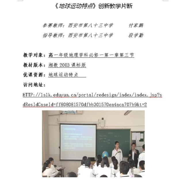 2019年12月31日,我校付家鹏老师上报的高一年级湘教版地理必修一第一章第三节《地球运动的一般特点》(情境创设类),经过西安市、省教育信息化管理中心评选后入围中央电教馆优秀案例征集活动。最终经过中央电化教育馆网络培训、意见修改、专家委员会评定等环节,成功入选《优质资源创新应用案例》专辑。据悉,全国各学段小学、初中、高中、职业教育共计138例优课入围。