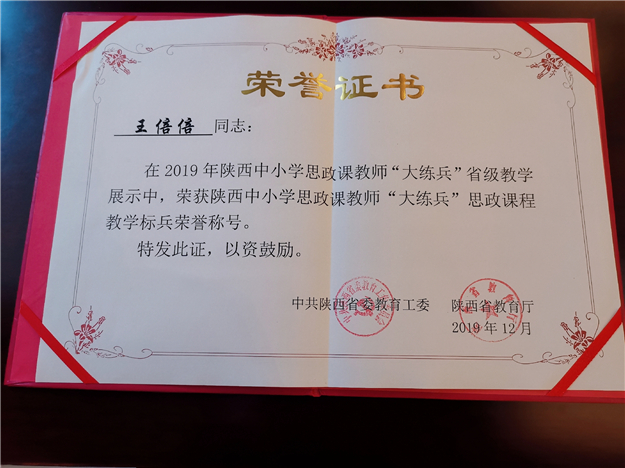 2019年12月26日,2019年陕西省中小学思政课教师“大练兵”活动总结表彰会在省教育厅隆重举行。我校教师王倍倍荣获2019年陕西中小学思政课教师“大练兵”思政课程教学标兵荣誉称号。中共陕西省委教育工委书记董小龙、副书记陈乃霞、陕西省教育厅副厅长马万清、陕西省委教育工委委员冀映秋出席本次表彰大会并为获奖选手颁奖,董小龙书记发表重要讲话。为深入学习贯彻落实习近平新时代中国特色社会主义思想,学习贯彻全国教育大会精神、学校思想政治理论课教师座谈会精神,中共陕西省委教育工委、省教育厅在全省范围内举办大规模、全覆盖的中小学思政“大练兵”。