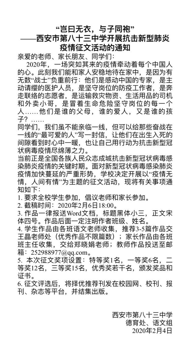 此次征文活动从发起到结束历时5天,全体语文组教师加班加点、齐心协力,显示了八十三中教师的素质和境界。疫情当前,我们无法亲赴前线帮助病患,但作为教师,坚守本职,认真工作,为学生做榜样、为教育作力所能及的事就是我们对国家的忠诚、对前线战士的支持。“冬天来了,春天还会远吗?”相信疫情过去,祖国大地依旧春暖花开!