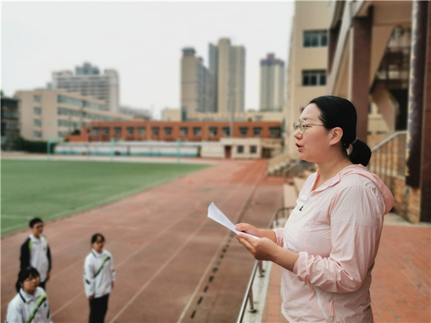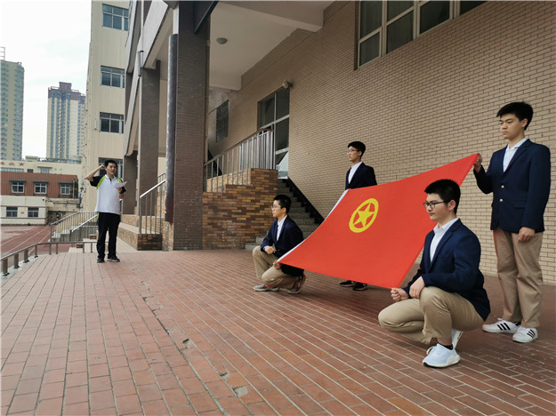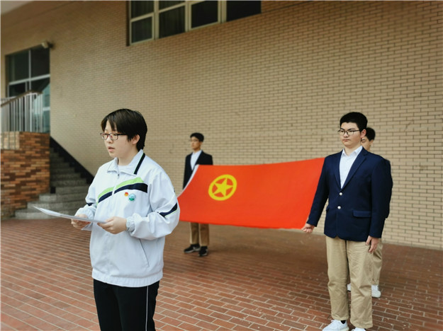 仪式在苏楠老师的主持下正式开始,第一项——出旗。同学们挺胸抬头,庄严站立,迎接团旗到来。