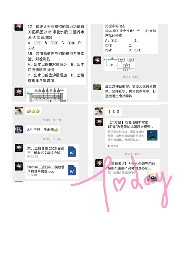 会议的最后,地理组把重点落在了即将到来的高考上。地理组的各位老师把王岚主任分享的多套试题的重点、优质题目做了详细的解读,与王岚主任一起多角度、多方面对试题进行分析。田护民主任把近来在各类期刊文章上对此次疫情与地理高考相结合的观点与大家分享,指出这些题目背后与地理深层次的关系值得大家的注意与思考。
