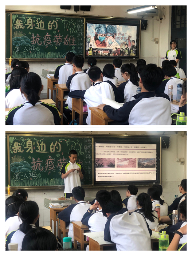 与此同时,学校其他班级还举行了“我身边的抗疫英雄”讲故事比赛。同学们通过现场讲述、录制视频、故事演绎等形式分享了自己的战疫故事和身边的战疫英雄,借此机会表达自己的家国情怀和青春感悟。同学们热情很高,积极参与,充分准备,认真聆听,相互交流,深受感动,纷纷表达了对英雄们的敬佩和感谢。