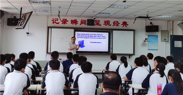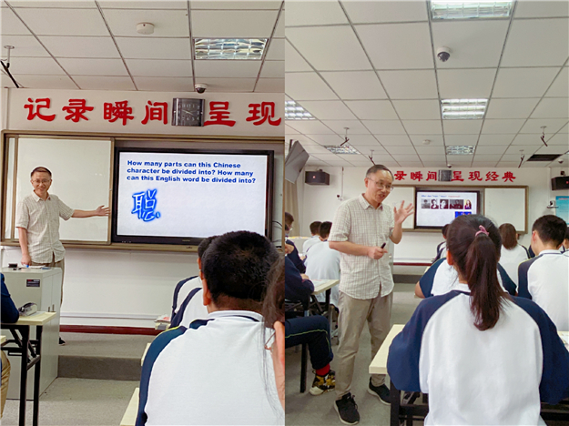 刘老师的课以一个“聪”子的字形结构解析导入,引入了构词法。接着,分别以金星、新冠病毒、手机信息和特朗普言论为例,讲解了trans-, de-, en-等前缀、-ee, -er等后缀的多个构词搭配,并让学生通过练习和学生活动熟练掌握词汇的构建。以一个“Biang”字,刘老师告诉大家:“爱你所学,总能迎难而上、寻得方法、攻克难关。”