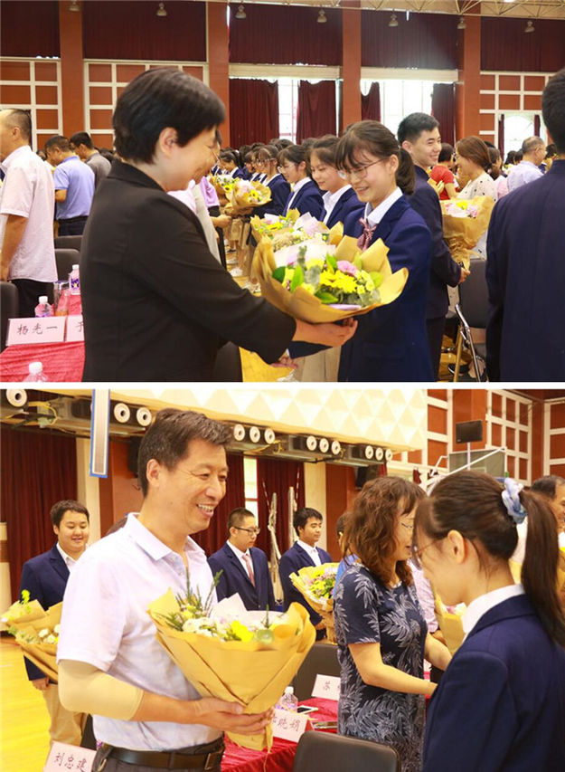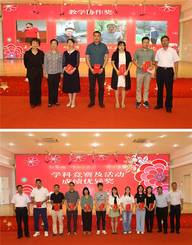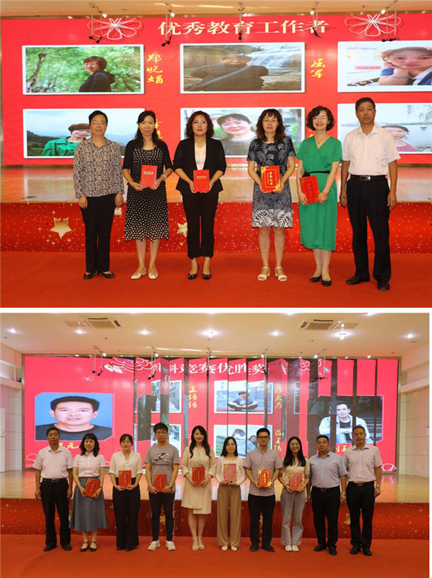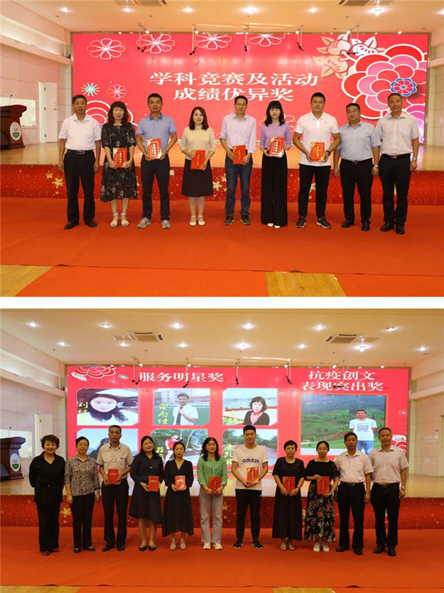 第四项,主持人宣读了一年来两校各级各类荣誉称号的受表彰教师和集体的名单。随后,校领导为获奖个人和集体颁奖。同时,主持人现场宣读了各位领导为获奖者撰写的颁奖词。