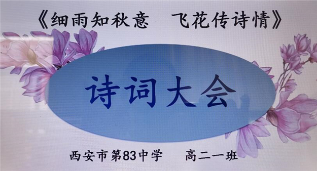 为传承和发展诗词文化,2020年10月15日西安市第八十三中学高2021届文科一班举行了以“细雨知秋意,飞花传诗情”为主题的诗词大会。经过前期语文老师及课代表的精心设计与策划,最终呈现了一场唯美而激烈的诗歌盛宴。