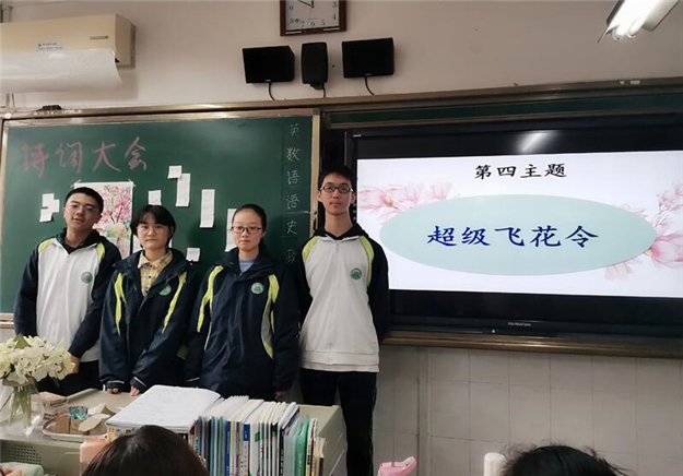 活动进入到白热化阶段,迎来最精彩的环节——“飞花令”。首先,储敏老师向同学们介绍了“飞花令”的“前世今生”。“春城无处不飞花,寒食东风御柳斜。”今天的飞花令虽不注重形式的局限性,但仍保留着其独具诗词之趣的特点。同学们熟悉规则后,便准备迎接第一个字——“春”。“春风桃李花开日,秋雨梧桐叶落时。”“春江潮水连海平,海上明月共潮生。”同学们才思泉涌,接二连三地说出含有“春”字的诗句,仿佛一缕春风洒进了冬日。“春”之遗韵还在,又迎来了第二个字——“花”。“乱花渐欲迷人眼,浅草才能没马蹄。”自古文人墨客无一不为花所倾倒。同学们在群芳之中吟诵着句句经典,顿时仿佛回到了流觞曲水之时,思尽能索,诗词之“花”开满了整个教室。