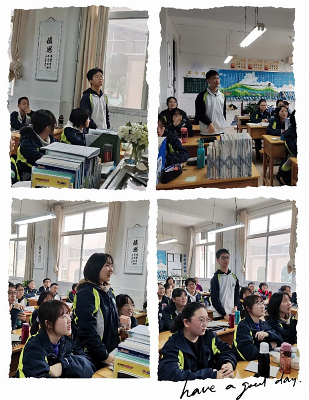 在第一环节“诗词风暴”中,“超级裁判”马翔同学说诗词的上半句,同学们接下半句。这一轮为全员参与,个人积分。同学们可谓各倾陆海,接诗如流——“长风破浪会有时,直挂云帆济沧海”;“几处早莺争暖树,谁家新燕啄春泥”。大家举手作答,热情高涨,震古烁今的千古名句如妙龄女子从他们的吟诵中缓缓走来。听课的各位老师也跃跃欲试,积极参与到其中,与同学们一起将比赛推入高涨的情绪之中。