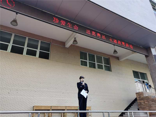 伴随着庄严的国歌声,五星红旗在朝阳中冉冉升起。“国旗下的演讲”结束后,孙真警官向我校全体同学作了禁毒教育主题演讲——“珍爱生命,远离毒品”。我校校级领导、全体师生参加了本次主题升旗仪式。