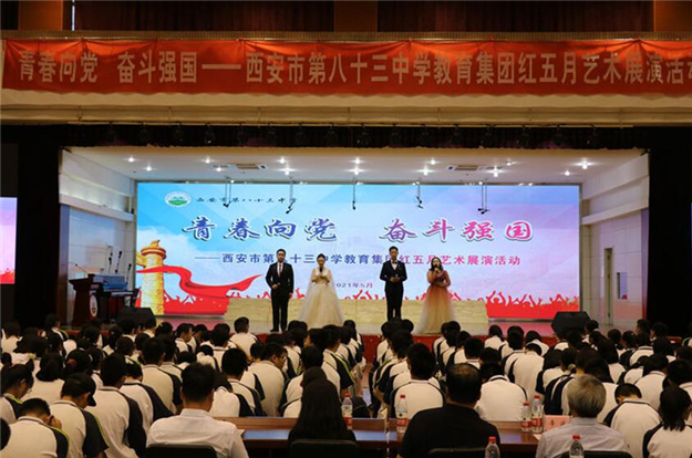 青春秀风采,艺术漫校园。2021年5月28日下午,为全面落实“立德树人”的根本任务和庆祝中国共产党成立100周年,“西安市第八十三中学教育集团红五月校园艺术节”在体育馆二楼拉开帷幕。本次艺术节的主题是“青春向党,奋斗强国”。西安市第八十三中教育集团特邀请西安黄河中学、西安交通大学附中参与本次活动,两校学生和八十三中教育集团校五校学生为大家带来了精彩的节目,五校部分师生观看了本场演出。